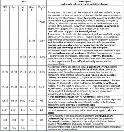 1)评价打分原则,介绍哈珀亚当斯大学的课程评分等级和具体标准(见下表);